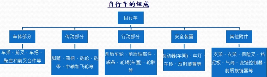 自行車的車架、輪胎、腳踏、剎車、鏈條等25個部件中,其基本部件缺一不可。