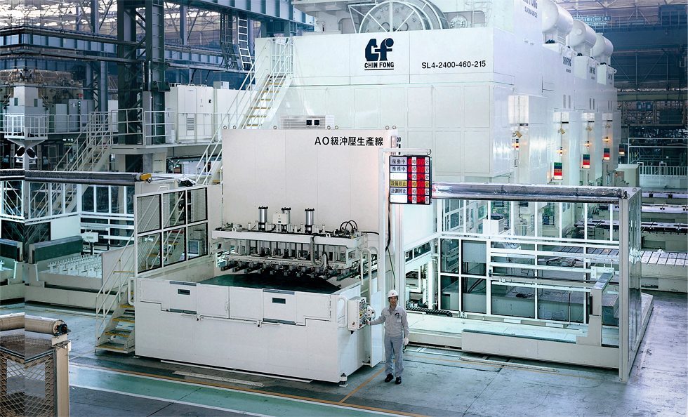汽車縱列式沖壓生產線沖壓設備一般規劃,第一工程為引伸加工,其次為切邊、沖孔等工程,如A0級生產線沖壓設備排列方式為2400噸、800噸、800噸、800噸,金豐為提升生產效率,將首臺規劃以連桿式長行程沖床取代以往傳統油壓式沖床,油壓機雖有慢速引申加工的優點,但產能受到油壓系統制限而無法有效提升,透過將沖壓傳動系統采連桿式機構,使作業加工區域緩速接近加工件、成形速度穩定、接觸時間長及非作業區域回程速度快等之特殊運動曲線設計,使材料成形加工時保有等速引伸特性,產能比油壓機有效提升30~40%,此作業規劃為目前最廣泛應用之方式,金豐公司目前沖壓生產線產能規劃配合周邊系統規劃,每分鐘產能可達8~12片之間。