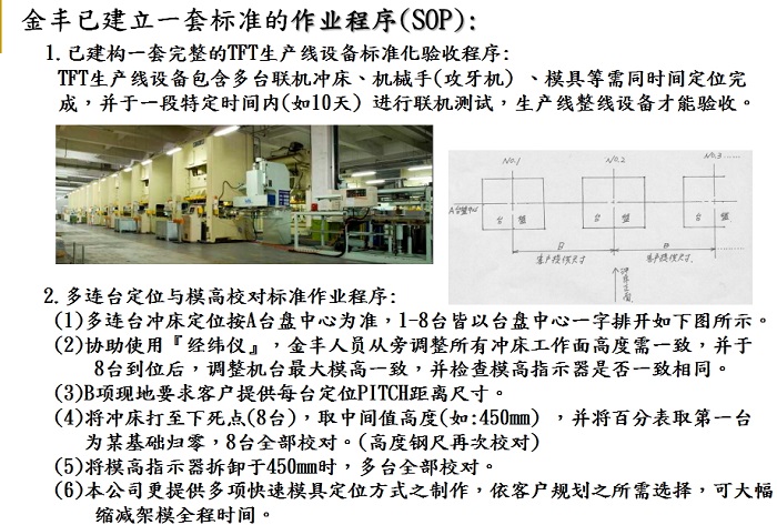 金豐于2001年參與國內第一條TFT產業110 TON ×6連臺配合機械手臂生產,為同業最先最早自動化生產系統。